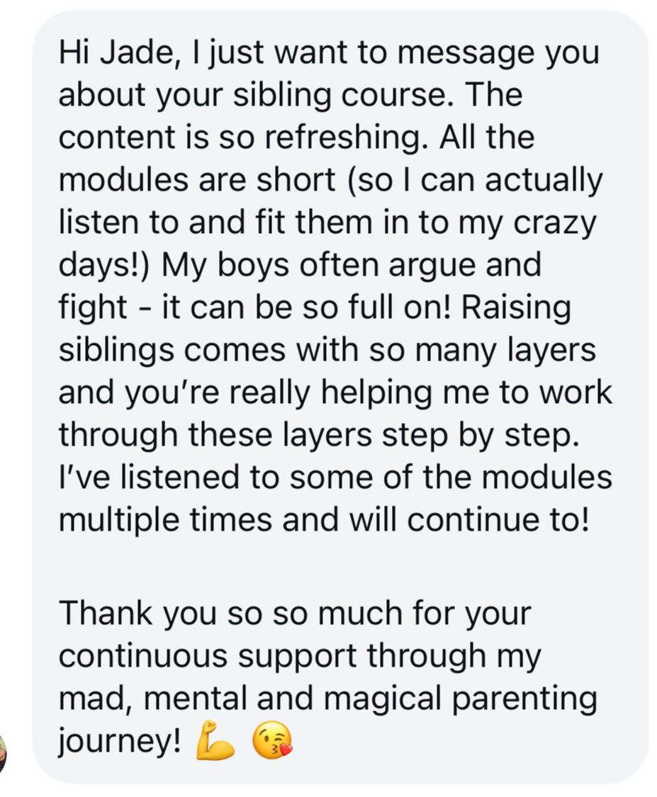 When you join, you get lifetime access to the full course, so you can return to it as your children grow and sibling dynamics shift. You do not need to rush through it or “get it right” first time.Â
